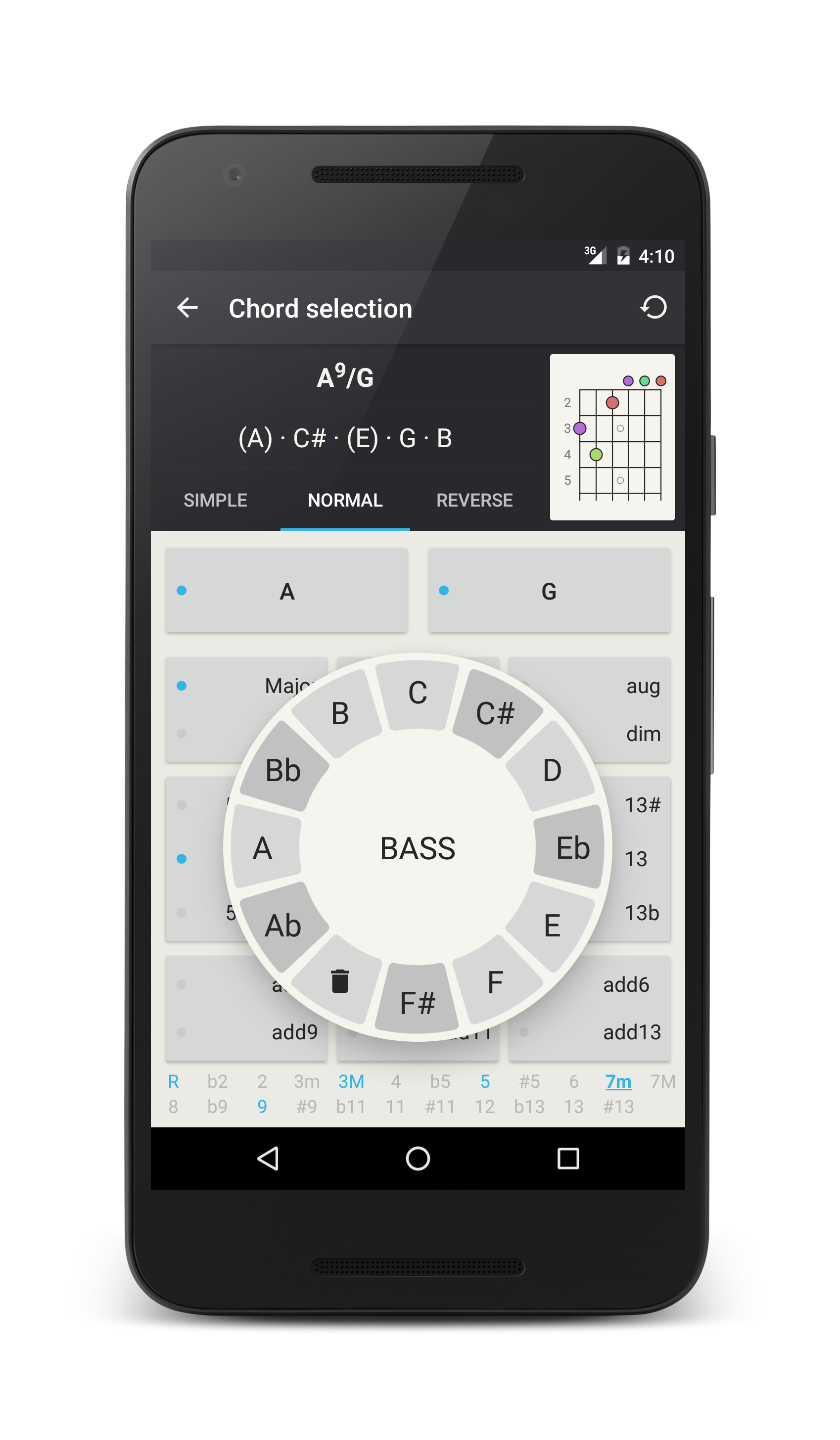 The principal way to enter chords is the normal mode. An intelligent keyboard is presented and you simply write the chord symbol with it. The keyboard responds and adapts itself so even if you don’t know music theory, simply matching parts of the symbol with it allows to create the chord. The root, and optionally the bass like F# in D/F#, can be selected at the top of the keyboard. As you enter the chord, the formula is updated and you can have a glance at the intervals involved. If you are a beginner, you can also use the simple mode. In this mode, about 50 common chords are already formed and ready to use. You just have to specify the root (and eventually a bass for slash chords).